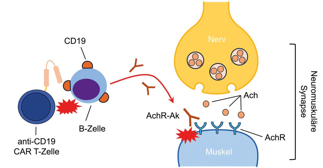 So konnte die Patientin vor 10 Monaten erfolgreich behandelt werden. Sie vertrug die Infusion mit den CAR T-Zellen sehr gut und erste sichtbare Erfolge stellten sich relativ schnell ein. Während des stationären Aufenthaltes war die Patientin auf einen Rollator als Gehhilfe angewiesen und bereits 10 Tage nach der Infusion der Anti-CD19 CAR T-Zellen konnte sie wieder frei laufen. Die Kraft kehrte zurück, die Müdigkeit verschwand und die Patientin war nahezu beschwerdefrei. Nach etwa vier Monaten kehrten auch die B-Zellen zurück, aber nicht die Krankheit. So lag der international gebräuchliche Quantitative Myasthenia gravis (QMG) Test, der u. a. die Beurteilung von Muskelkraft (inkl. Schlucken und Sprechen) und Vitalkapazität beinhaltet, zum Zeitpunkt der Zellinfusion bei 15 Punkten (Punktewerte 0 – 39) und ist jetzt bei 2. Eine Substitution von Immunglobulinen war nie nötig. Jetzt hoffen die Professoren Haghikia und Mougiakakos gemeinsam mit der Patientin, dass die Wirkung der CAR T-Zellen lange anhält, möglichst für immer.