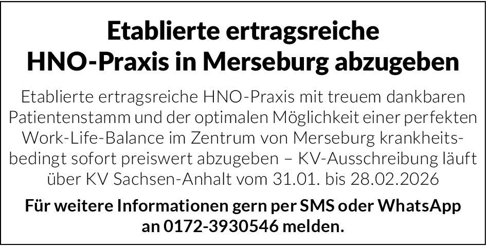Etablierte ertragsreiche HNO-Praxis mit treuem dankbaren Patientenstamm und der optimalen Möglichkeit einer perfekten Work-Life-Balance im Zentrum von Merseburg krankheitsbedingt sofort preiswert abzugeben – KV-Ausschreibung läuft über KV Sachsen-Anhalt vom 31.01. bis 28.02.2026