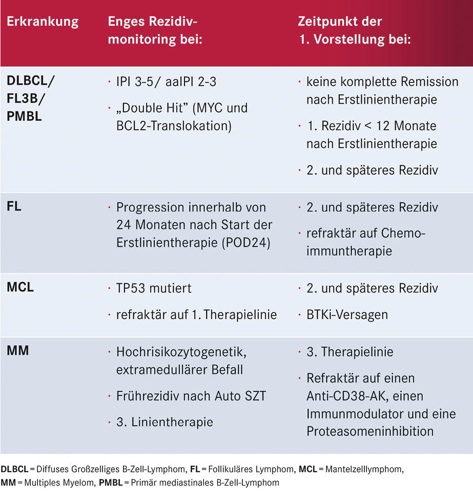 Tabelle 3: Ausgewählte Kriterien, die für eine perspektivisch indizierte CAR-T-Zell-Therapie und eine frühzeitige Vorstellung im CAR-T-Zell-Zentrum sprechen