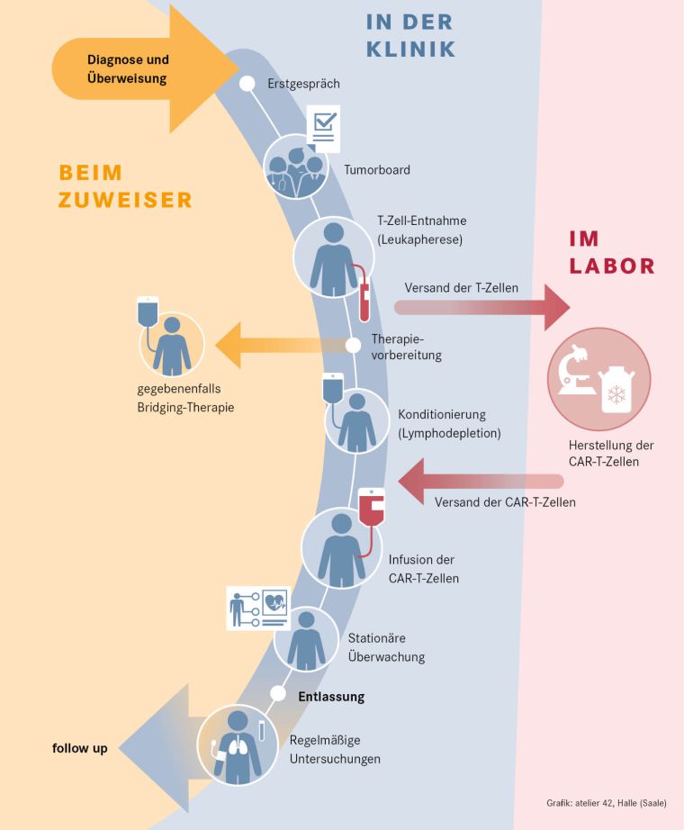 Inklusive lymphodepletierender Therapie sind die Patienten damit zumeist für 15 bis 20 Tage in stationärer Betreuung. Anschließend erfolgt eine strukturierte Nachsorge am CAR-T-Zell-Therapiezentrum und durch die betreuenden Hämatologen.