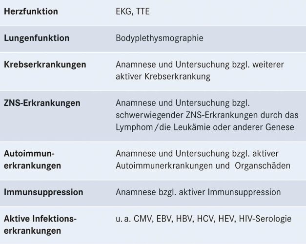 Tabelle 4: Ausgewählte Voruntersuchungen vor CAR-T-Zell-Therapie, gegebenenfalls weitere patientenindividuelle Untersuchungen
