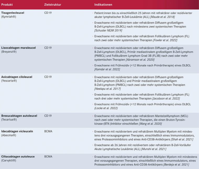 Tabelle 2: Aktuell für die Behandlung von Lymphomen in Deutschland zugelassene CAR-T-Zell-Therapien mit Zielantigen und Indikationen