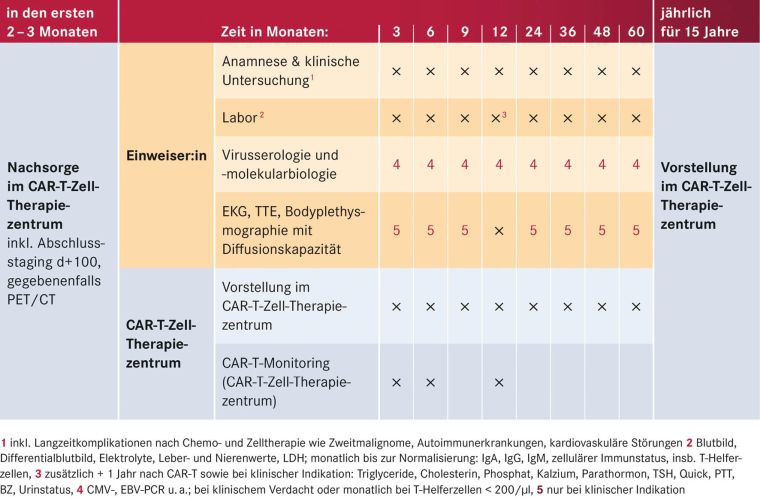 Nach der CAR-T-Zell-Gabe verbleiben die Patienten zunächst für mindestens zehn Tage in stationärer Behandlung. Anschließend erfolgt während der ersten 100 Tage nach CAR-T-Zell-Infusion die Nachsorge über die Ambulanz des CAR-T-Zell-Zentrums. Dabei ist im ersten Monat eine Vorstellung mindestens einmal pro Woche, bis Tag +100 meist einmal alle zwei Wochen notwendig. Die weitere Betreuung erfolgt je nach klinischem Bedarf und notwendigen Staging-Untersuchungen in Zusammenarbeit mit den zuweisenden ambulanten Hämatoonkologen (siehe Tabelle 5) (Bonifant et al. 2016).