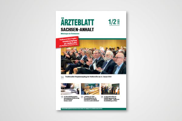 | 06 Ärztliche Weiterbildung in Sachsen-Anhalt | 06 Neu erteilte Weiterbildungsbefugnisse | 12 Infoblatt: Reform des Vormundschafts- und Betreuungsrechts: Einsichtsrecht für Ärztinnen und Ärzte in das Zentrale Vorsorgeregister der Bundes- notarkammer und Ehegatten-Notvertretungsrecht | 12 Mitteilung zum Haushaltsabschluss 2022 | 13 Ablauf von Übergangsbestimmungen, Neubewertung der Weiterbildungsstätten | 14 Neujahrsempfang der Heilberufler | 17 Umsetzung der Richtlinie Hämotherapie in Sachsen-Anhalt | 18 30 Jahre Ethikkommission und Ambulante Ethikberatung der Ärztekammer Sachsen-Anhalt | 21 Aktuelle Meldung zu Sterbefällen durch vermehrte Gruppe-A-Streptokokken-Infektionen | 22 Ärzteversorgung Sachsen-Anhalt: Beschlüsse der Kammerversammlung