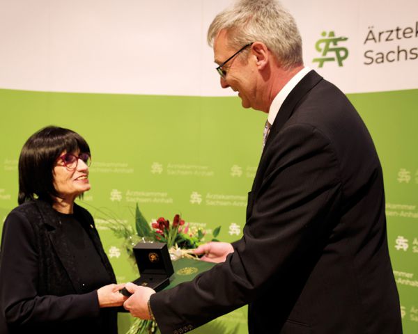 Einen ebenso kraftvollen wie berührenden Akzent setzte anschließend die Auszeichnung von Dr. Petra Bubel. In einer sehr persönlichen Laudatio würdigte Kammerpräsident Prof. Uwe Ebmeyer das langjährige Wirken der engagierten HNO-Ärztin aus Eisleben. Als Vorstandsmitglied der Ärztekammer verkörpert Dr. Bubel beispielhaft den leidenschaftlichen Kampf um die standespolitische Mitsprache und die Gewinnung des ärztlichen Nachwuchses. Prof. Ebmeyer zeichnete den Weg einer Kollegin nach, die sich nie scheute, auch unbequeme Wahrheiten auszusprechen, wenn es um die Qualität der Ausbildung oder die Zukunft der ärztlichen Freiberuflichkeit ging. Dass ihr Engagement tiefe Spuren in der Kollegenschaft hinterlassen hat, zeigte sich unmittelbar nach der Verleihung: Das gesamte Plenum erhob sich zu Standing Ovations – ein seltener und Gänsehaut erzeugender Moment der kollektiven Anerkennung, der die tiefe Wertschätzung für ihren unermüdlichen Einsatz und ihre Persönlichkeit eindrucksvoll unterstrich. Dr. Bubel nutzte die Gelegenheit, um sich nach ihrem Dank für das Ehrenzeichen noch einmal ans Plenum zu wenden: „Wir müssen uns weiter einsetzen – für Nachwuchs, ein starkes ambulantes System und unsere Freiberuflichkeit“, appellierte sie nachdrücklich an die Kammerversammlung.