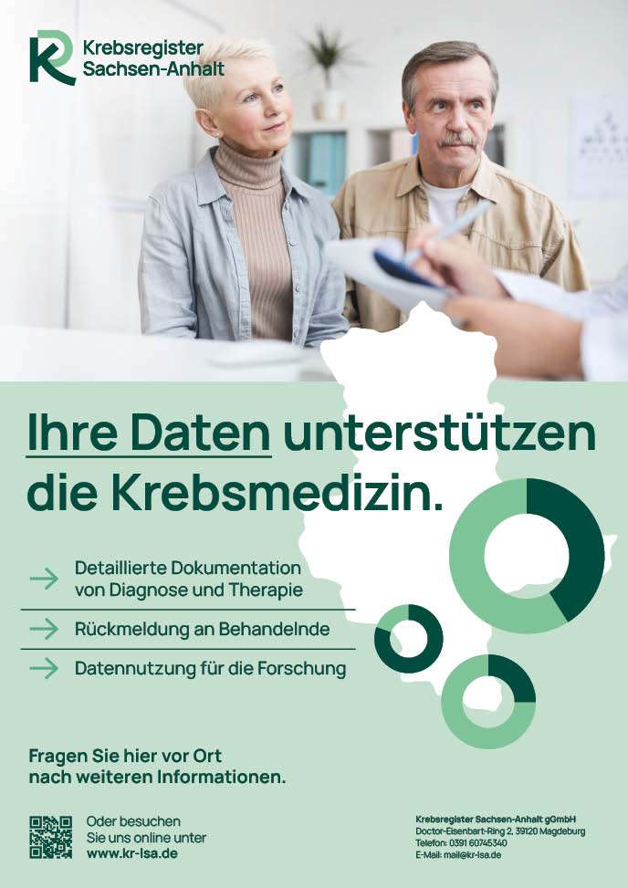 Informationsplakat des Krebsregisters Sachsen-Anhalt zur Unterstützung der Krebsmedizin durch Datendokumentation und Forschung.