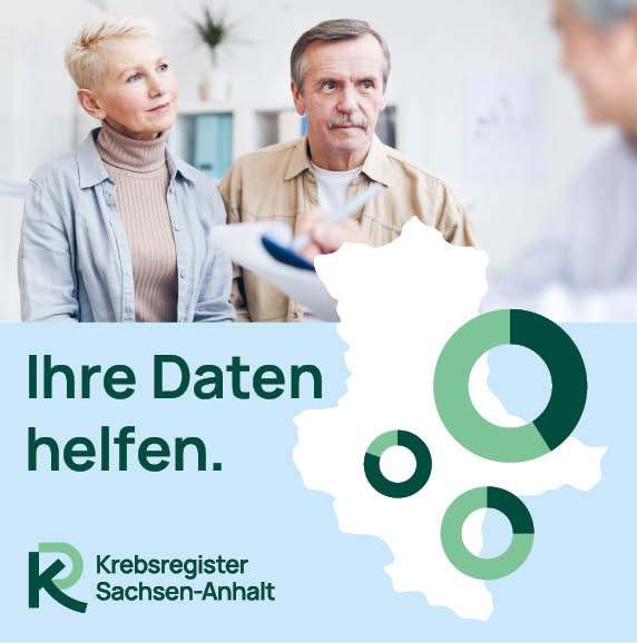 Informationsmotiv des Krebsregisters Sachsen-Anhalt mit Patienten im Arztgespräch und dem Hinweis „Ihre Daten helfen“.